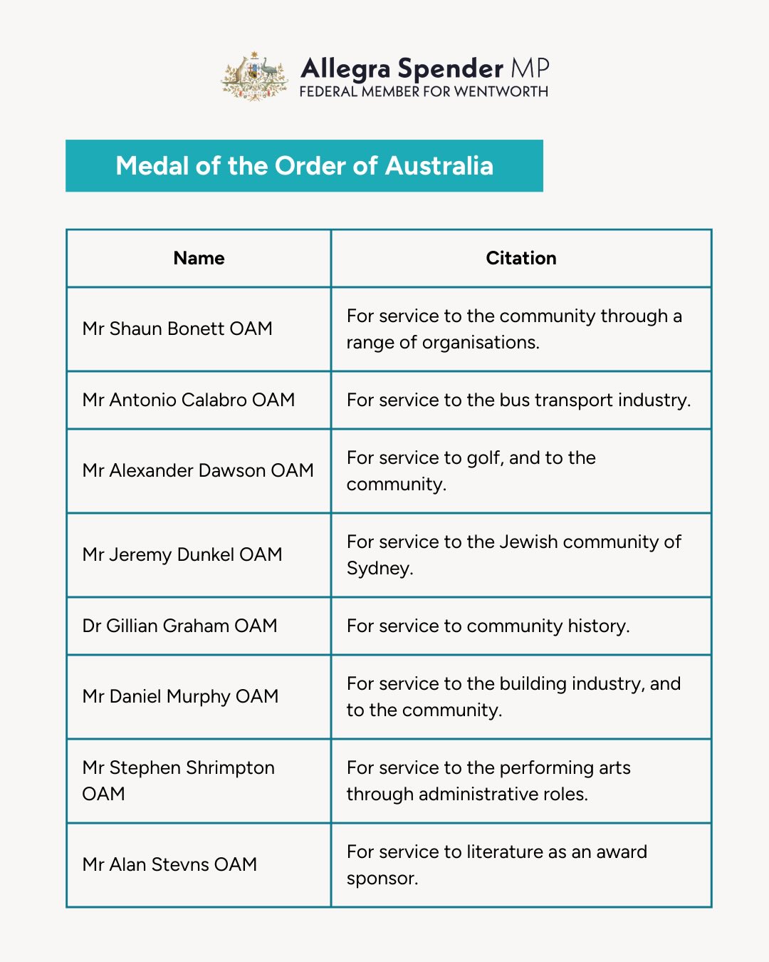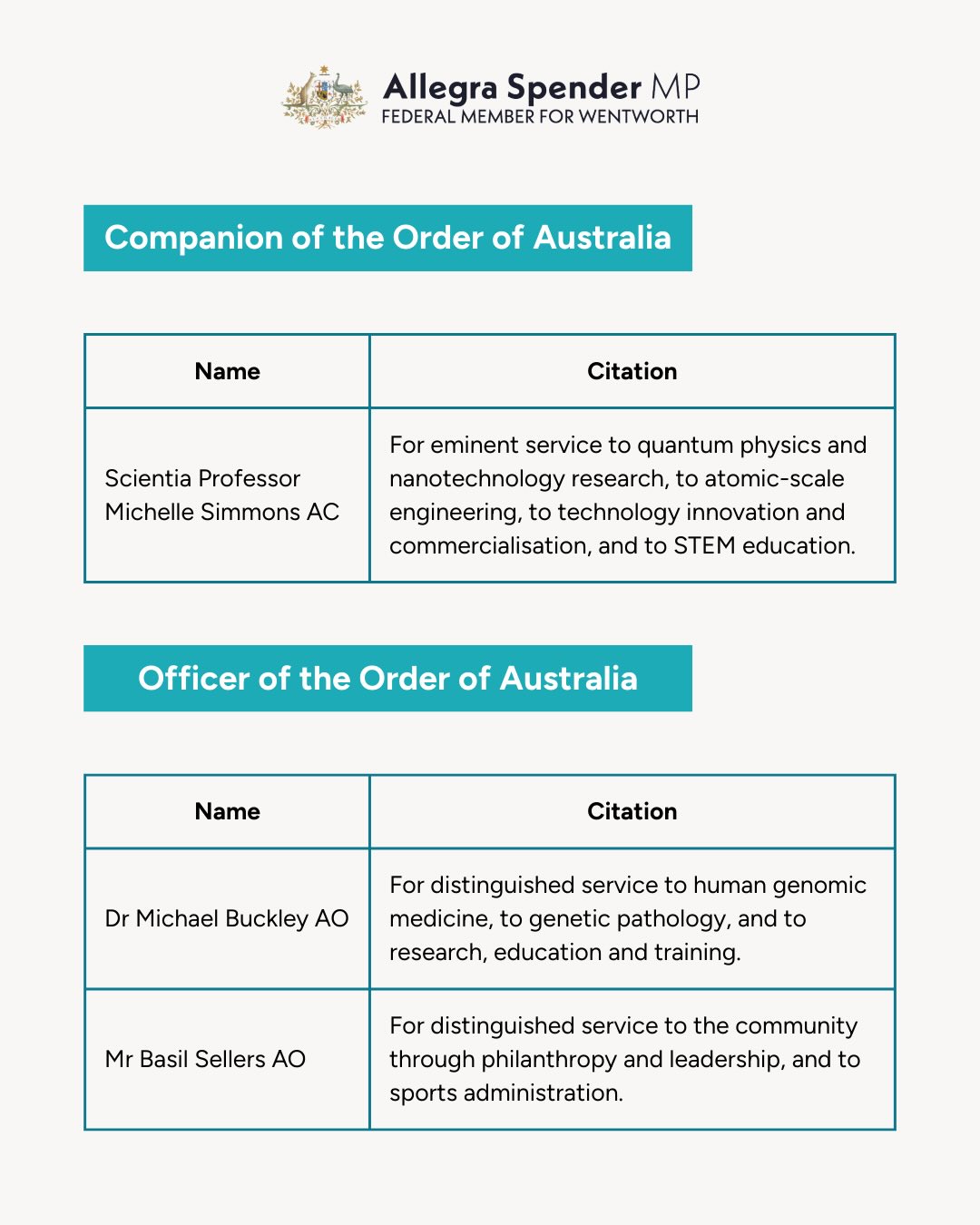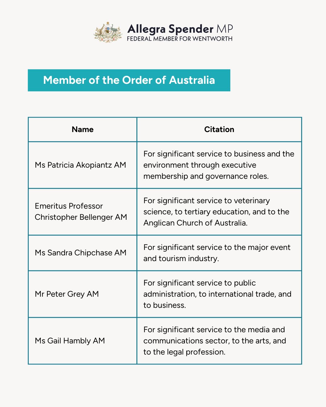 Congratulations to Wentworth's 2026 Australia Day Honours recipients! What a big list this year. Thank you for your service to our country.