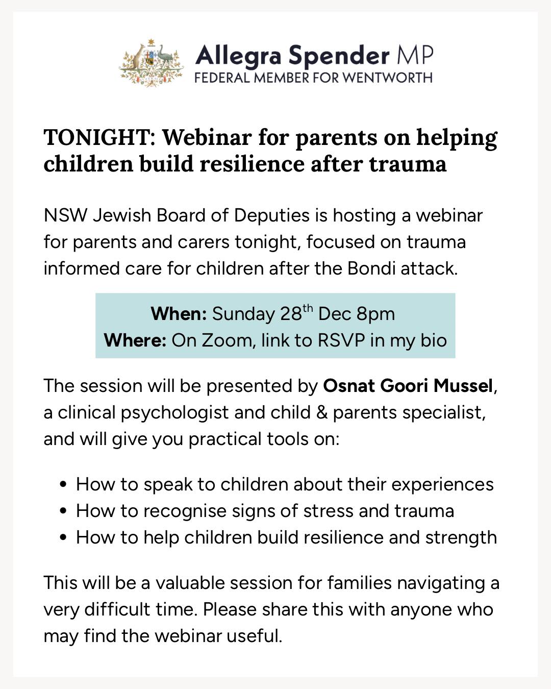 NSW Jewish Board of Deputies is hosting a webinar tonight at 8pm on trauma informed support for our children after the Bondi attack. If you’d like to join, please register at the link below: