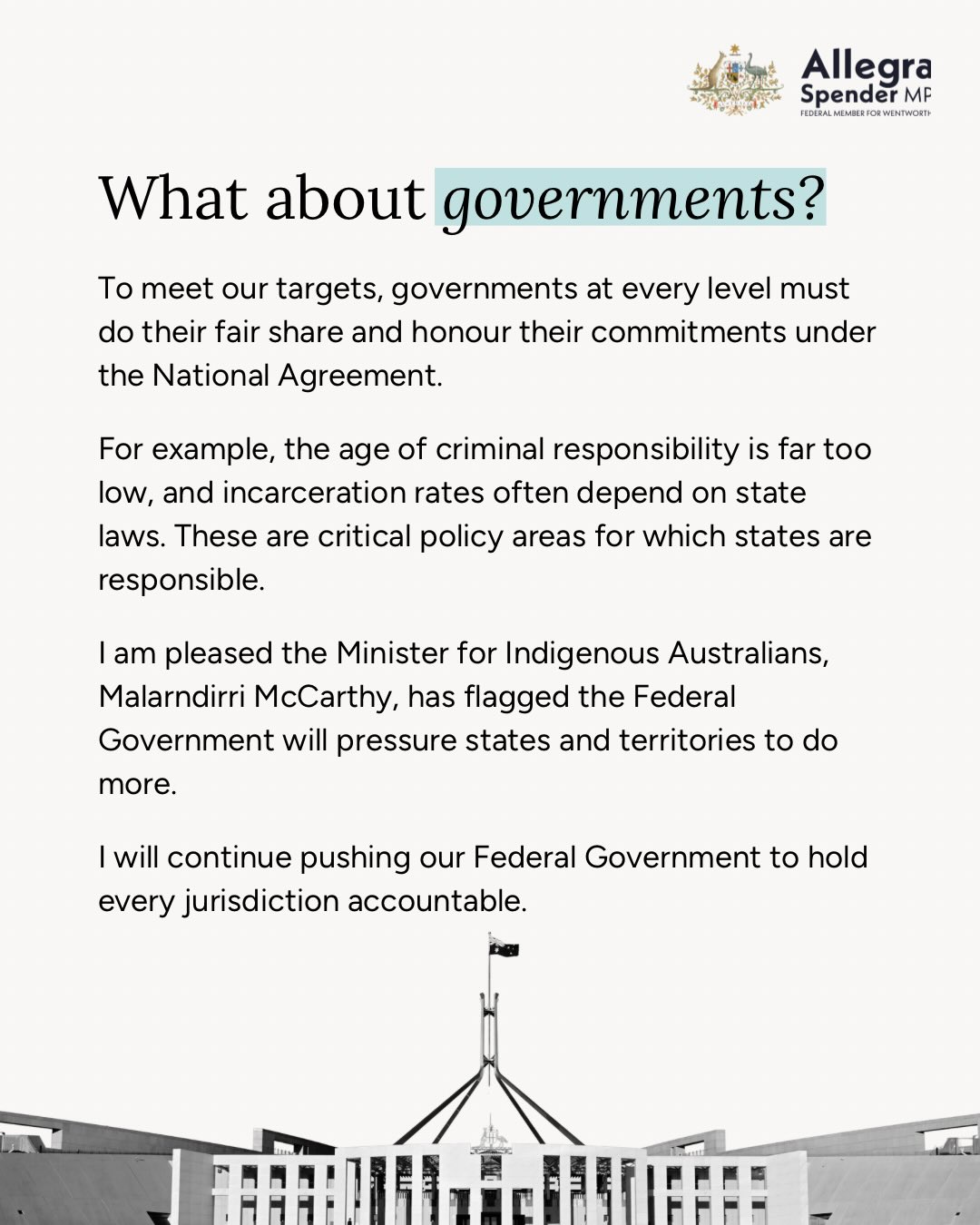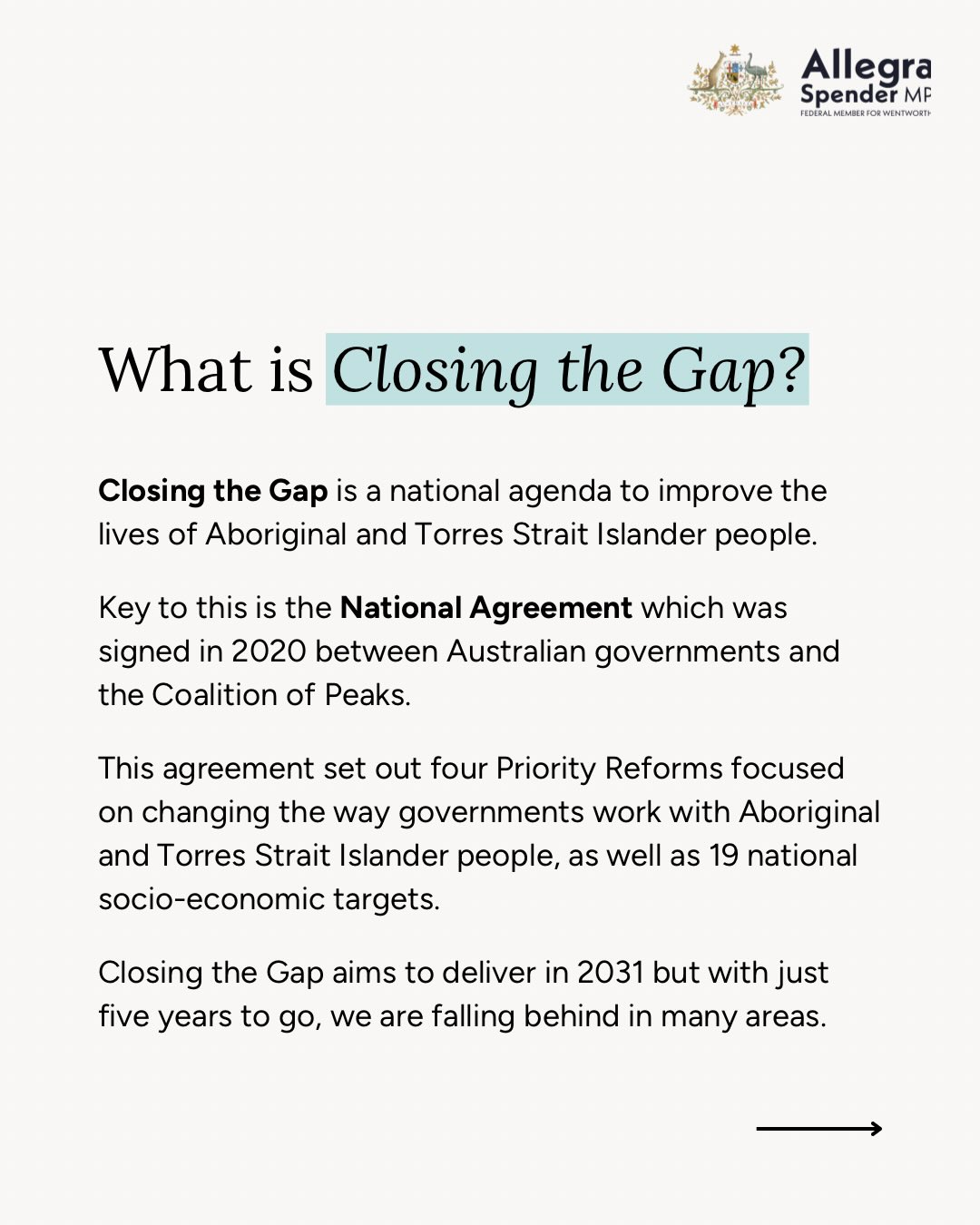 While we still have 5 years to deliver, it is clear that the status quo is not good enough. Governments at all levels must do their fair share and commit to genuinely listening to and working together with our Aboriginal and Torres Strait Islander people.