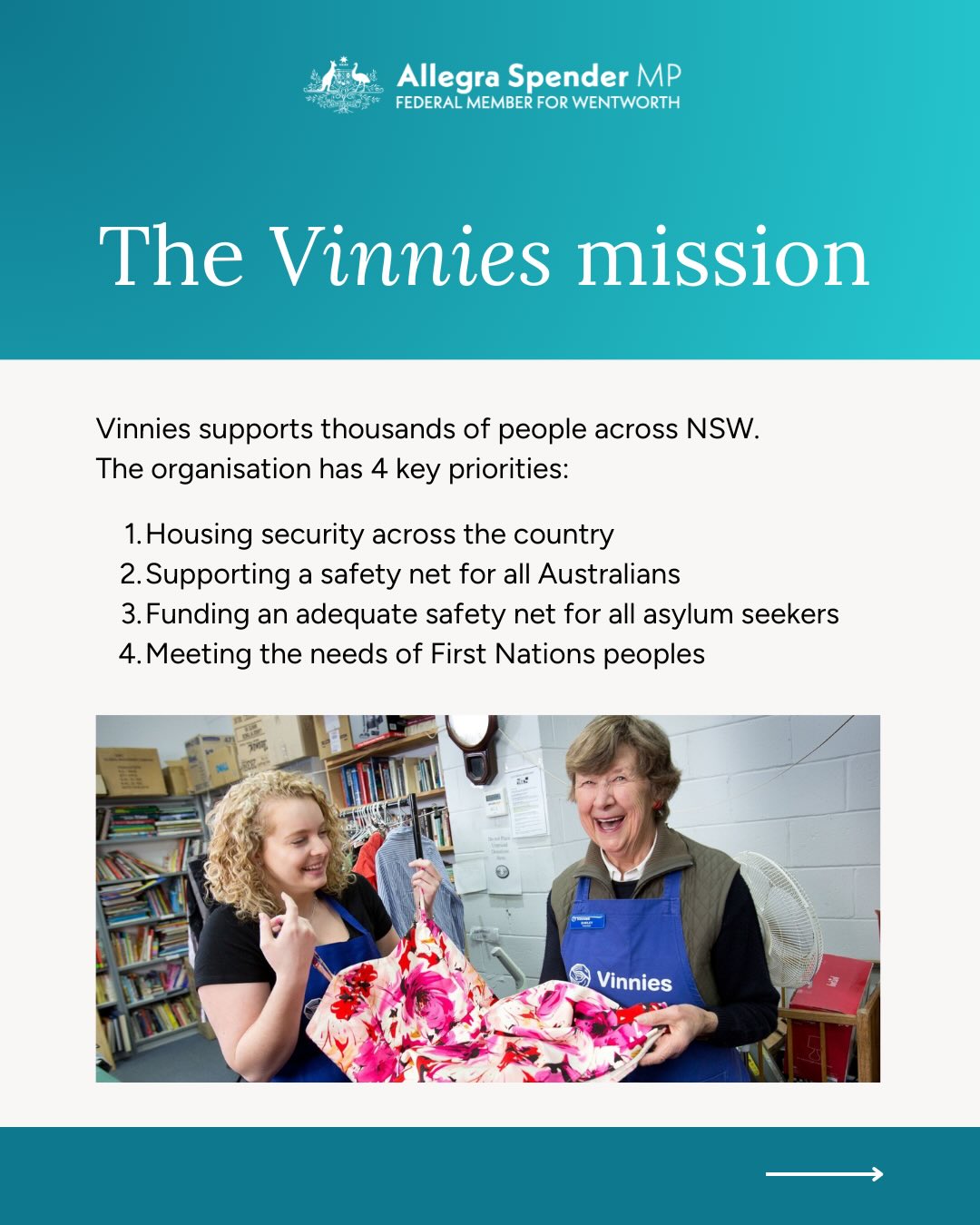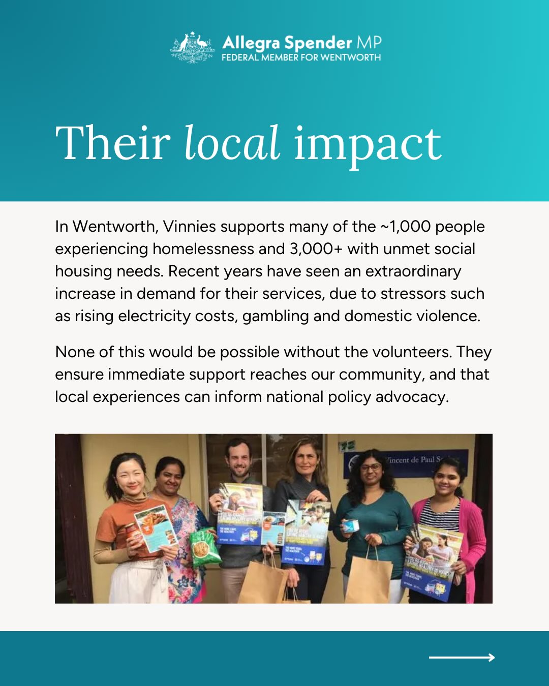 I have been so lucky to work with our local Vinnies members over the past few years and what has been clear is their impact is so far reaching, and deeply felt. They offer support in a variety of ways - whether it's providing housing, visa assistance, food, mental and physical health support. They're there for our community at the most difficult times, acting as a safety net for all Australians.