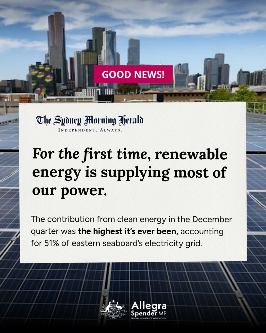 Yesterday's AEMO report confirms some fantastic news for the start of the year: for the first time, renewables supplied over 50% of quarterly NEM energy needs! This is an important milestone for our transition away from coal-fired power stations to a clean energy future.