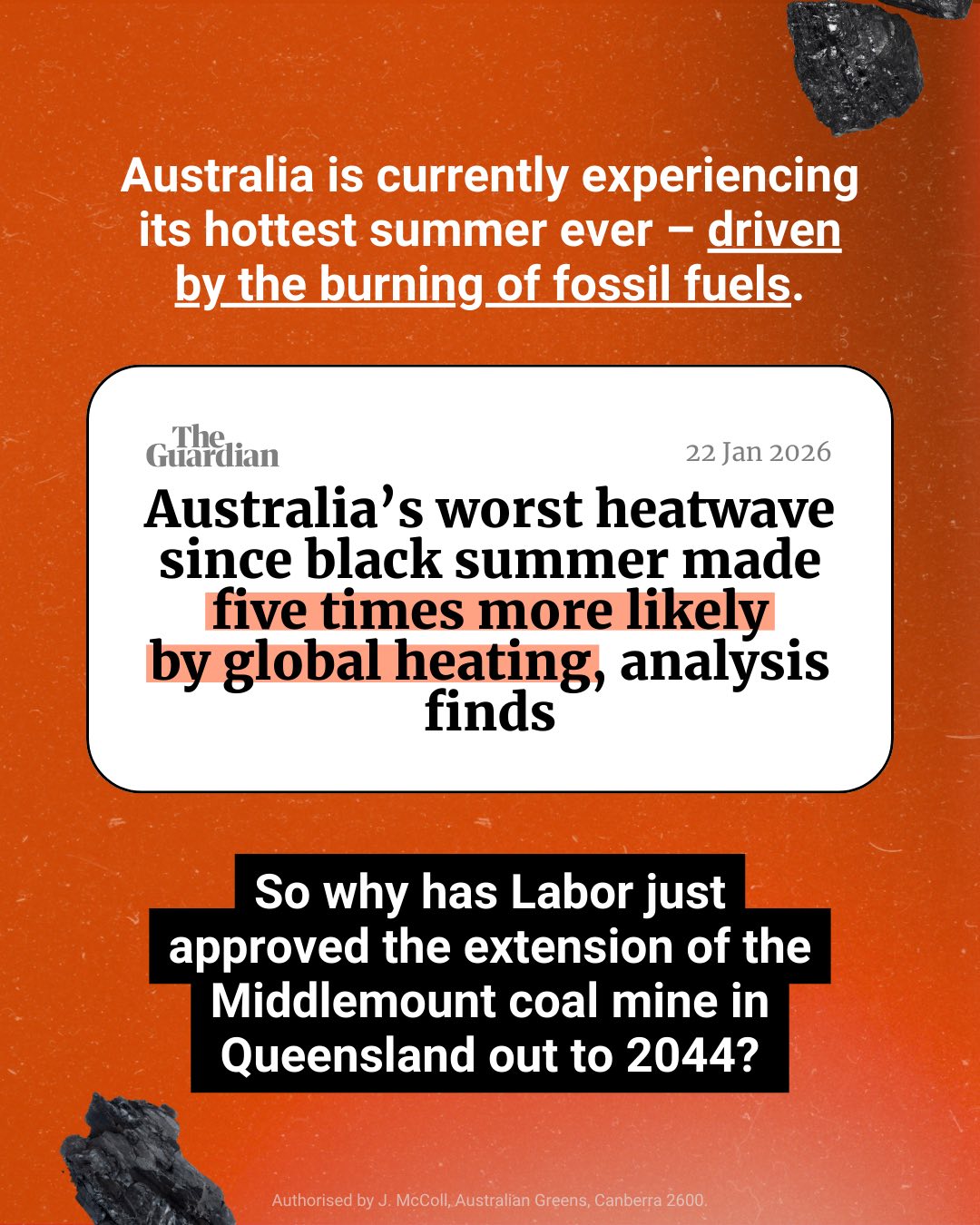 This extension of the Middlemount coal mine in Queensland will lock us in for worsening floods, fires and heatwaves will insurance bills skyrocket - all so the big fossil fuel corporations can continue to profit.