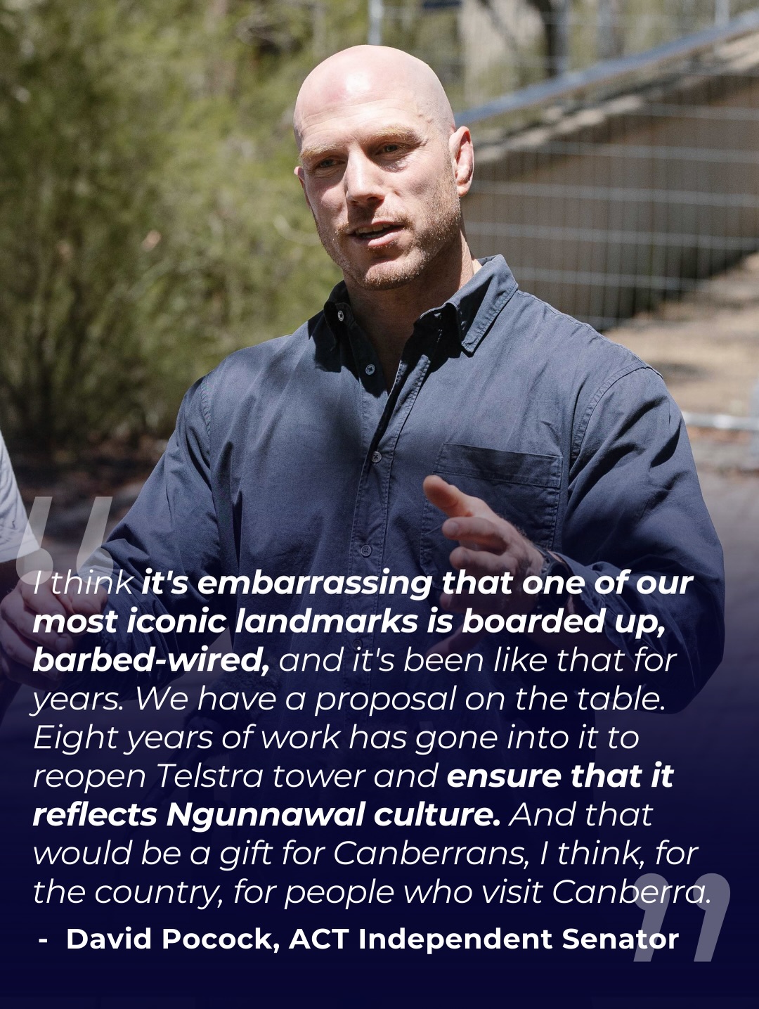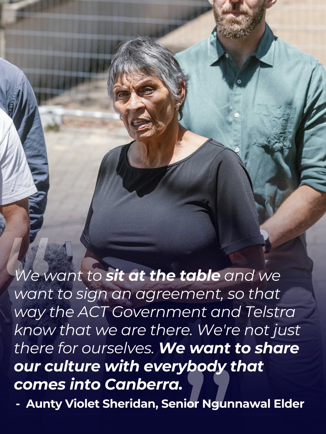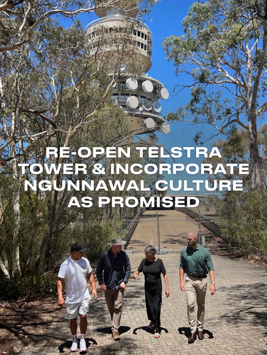 We stood with Ngunnawal Traditional Owners Aunty Violet Sheridan and Richie Allan calling on Telstra to honour their promise to incorporate Ngunnawal culture in the redevelopment of Telstra Tower and take forward plans for a Ngunnawal Cultural Centre. We urge the ACT Government to use its position to ensure Ngunnawal Traditional Owners are at the table and part of the decision making on the future of this iconic site.