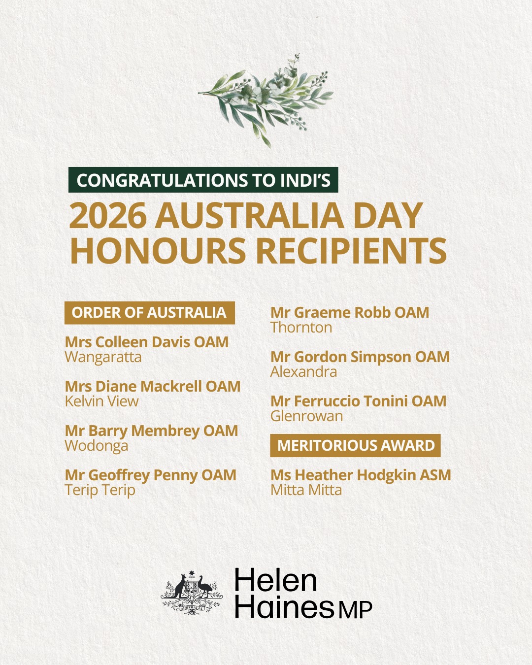 Congratulations to the 2026 Australia Day Honours recipients from across Indi.