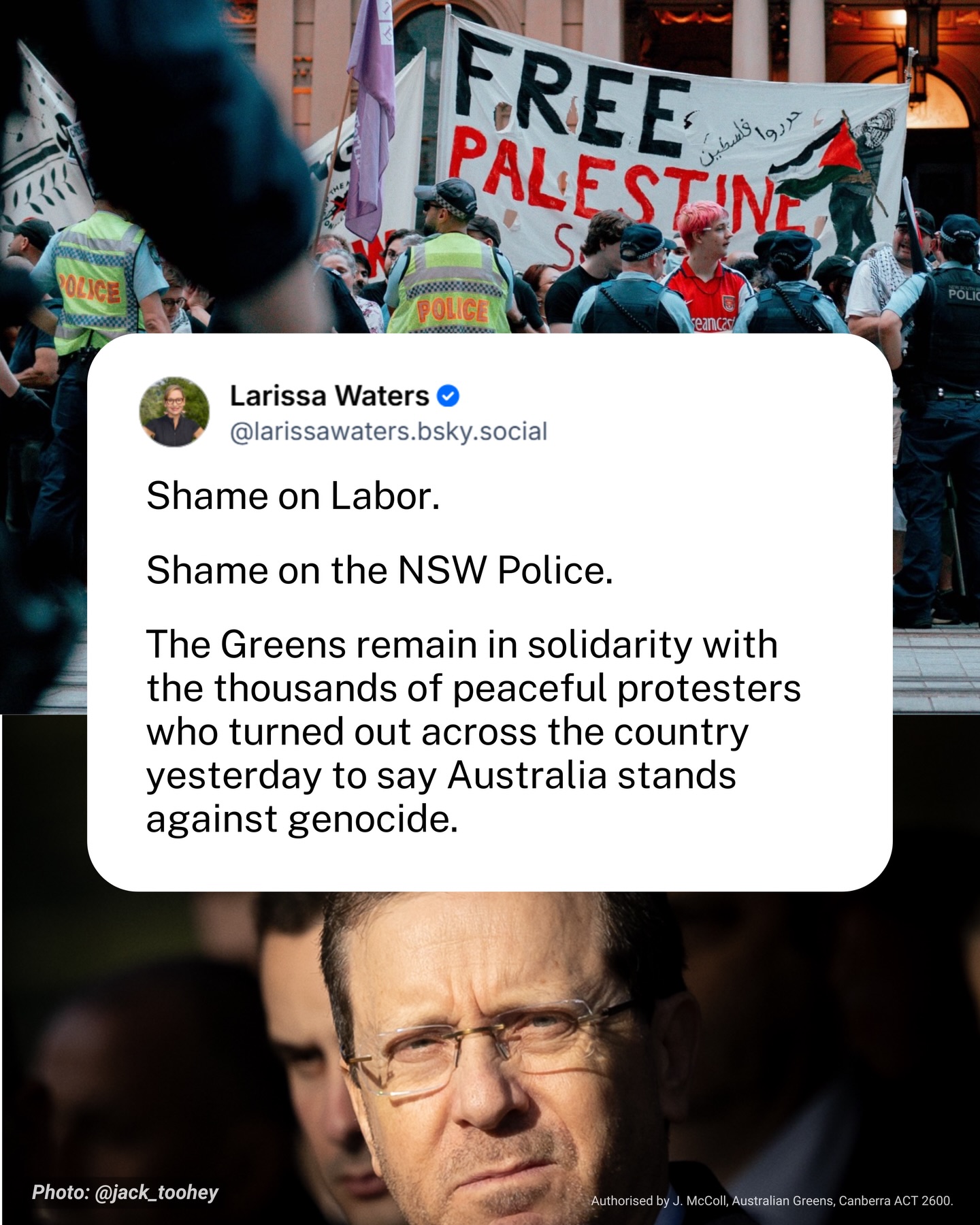 Solidarity with the thousands of protestors who turned out across the country yesterday to say that Australia must not be complicit in genocide.