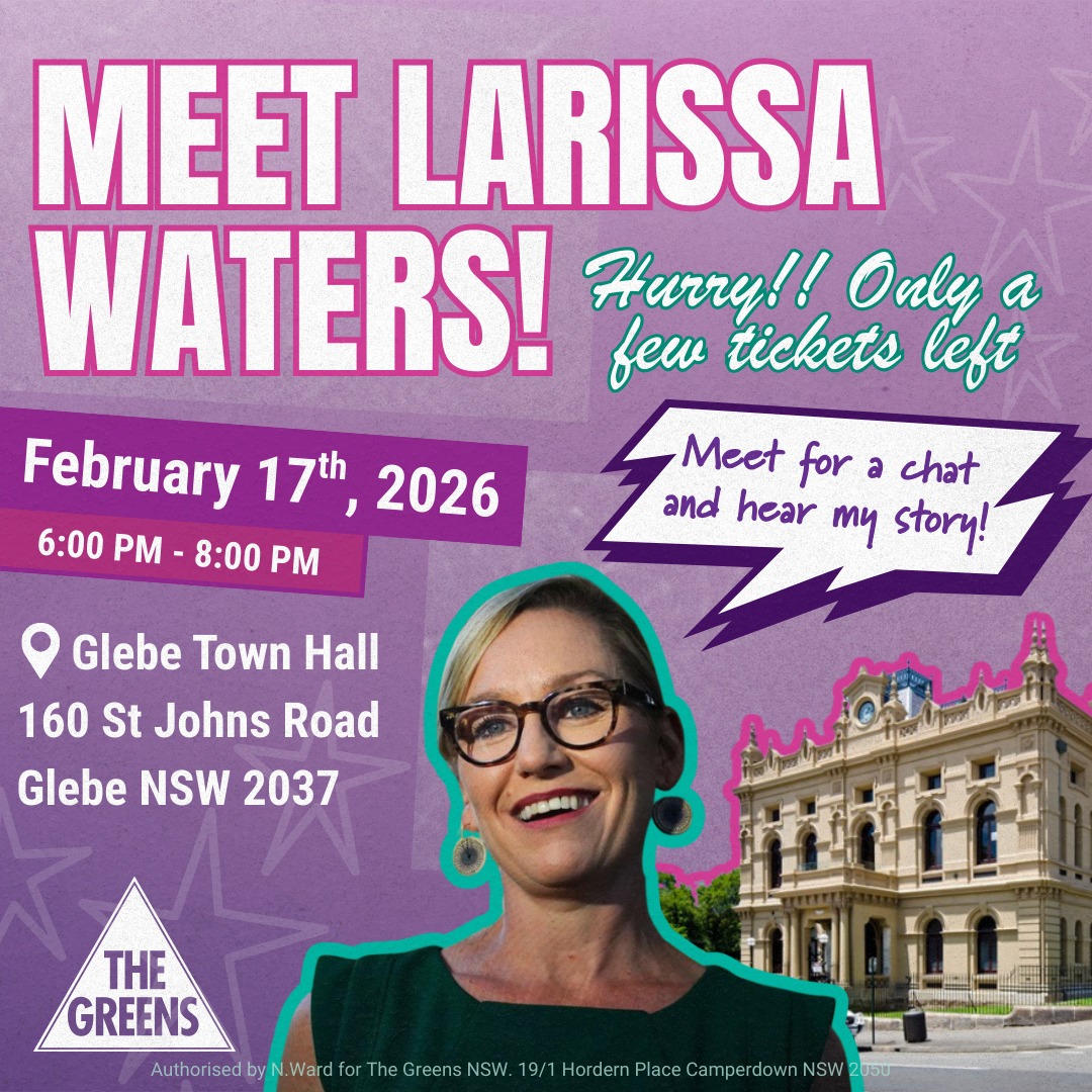 The Greens NSWHurry, there are only a few tickets left!To register, see the link in the comments.View Original | AusPol.co Disclaimer Post navigationNSW Greens: Step inside the story of Larissa Waters — her journey, her leadership, and her vision for...