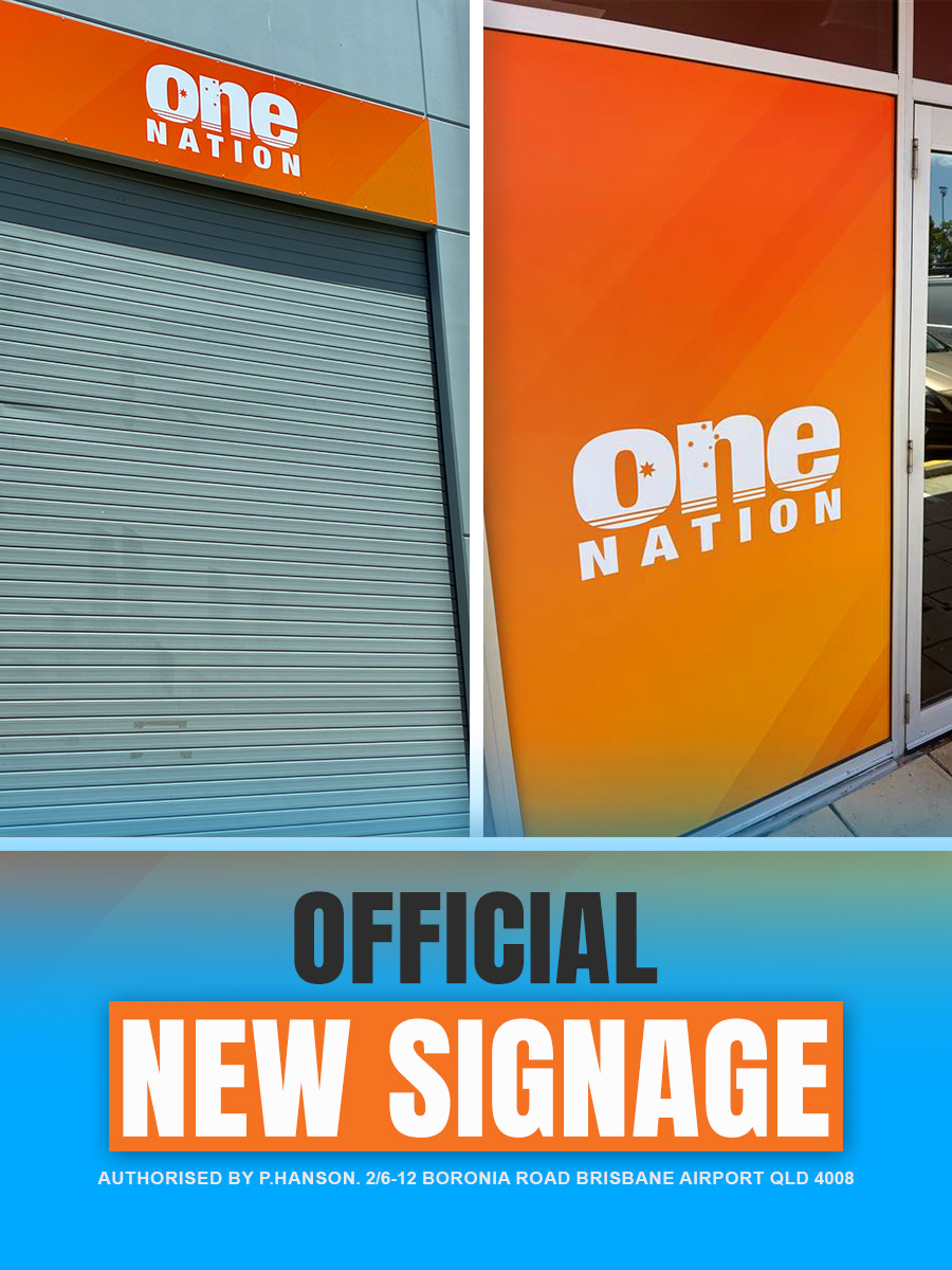 It's official. One Nation has changed the signage at our National Headquarters in Brisbane. "One Nation" all the way.