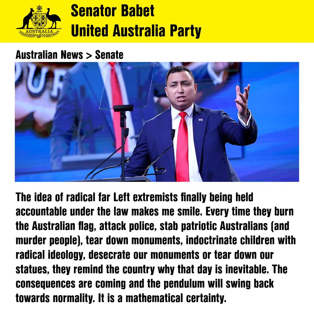 Senator BabetANTIFA masquerade as anti fascists while practising fascism. Their days are numbered.View Original | AusPol.co Disclaimer Post navigationRalph Babet: Andrew Hastie is many things: a former SAS soldier, a loving father and husband, and a... Ralph Babet: I reported this post from Senator Babet to the Australian Federal Police this morning....
