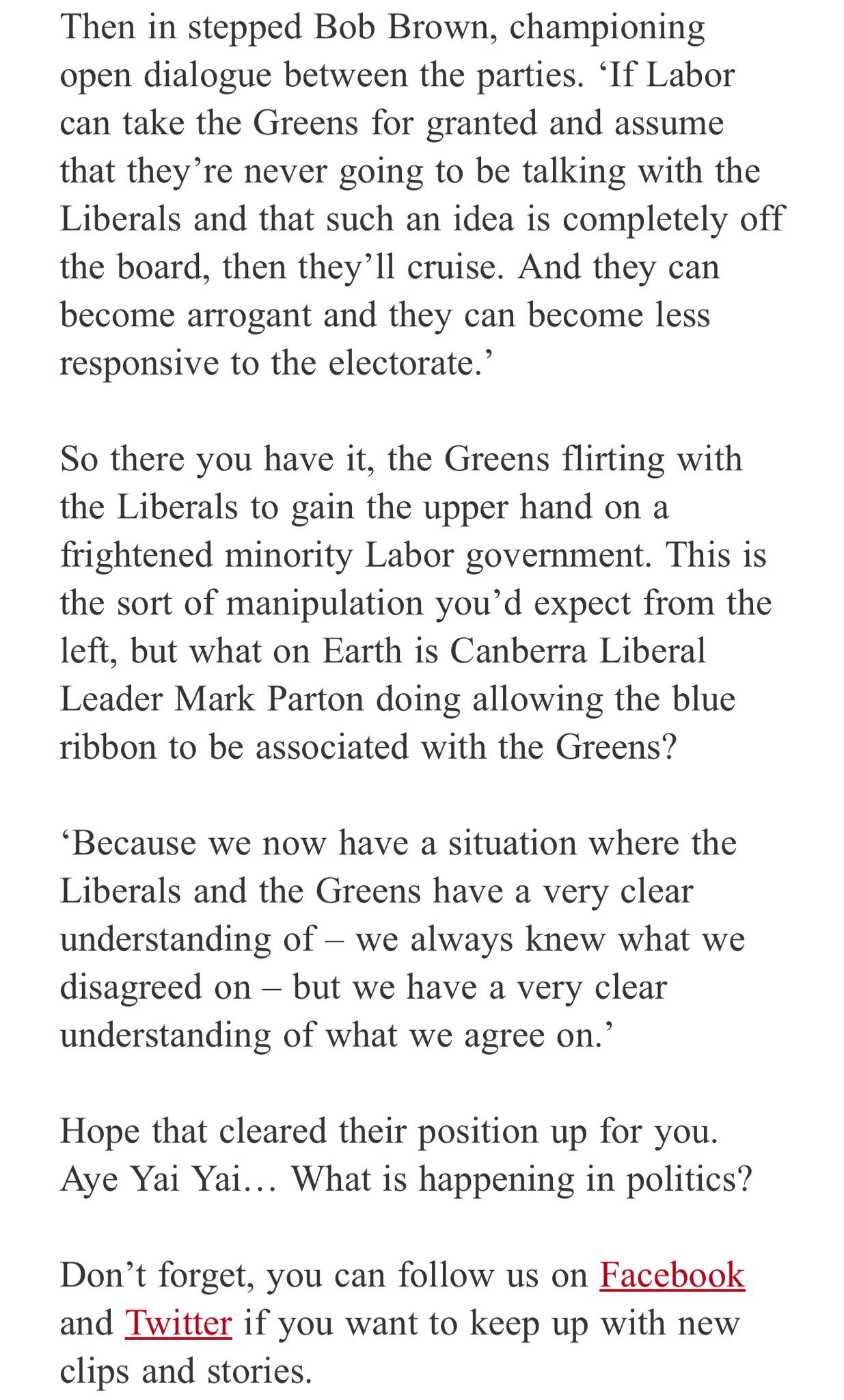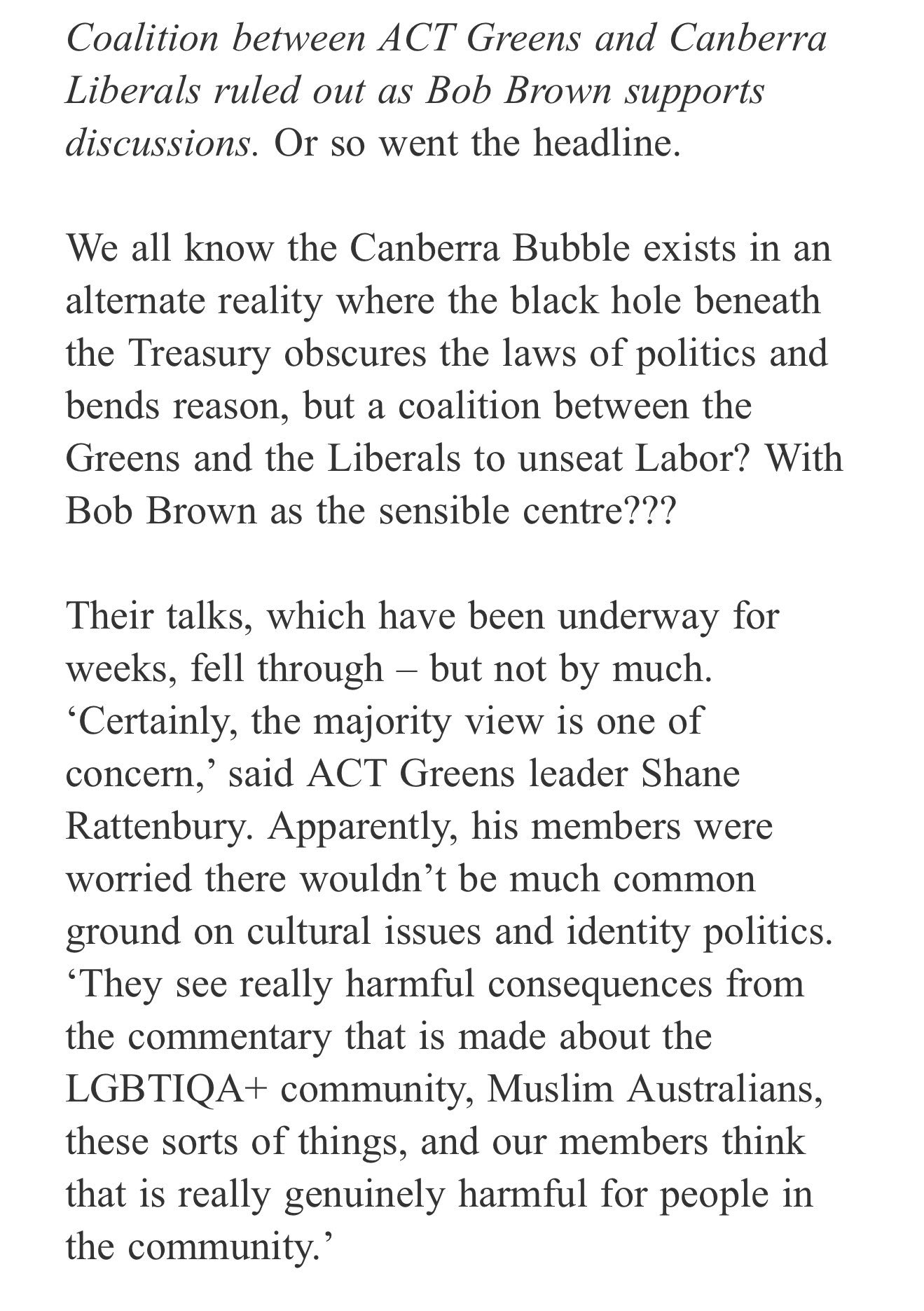 The Canberra Liberal party considered working with the Greens in a coalition.