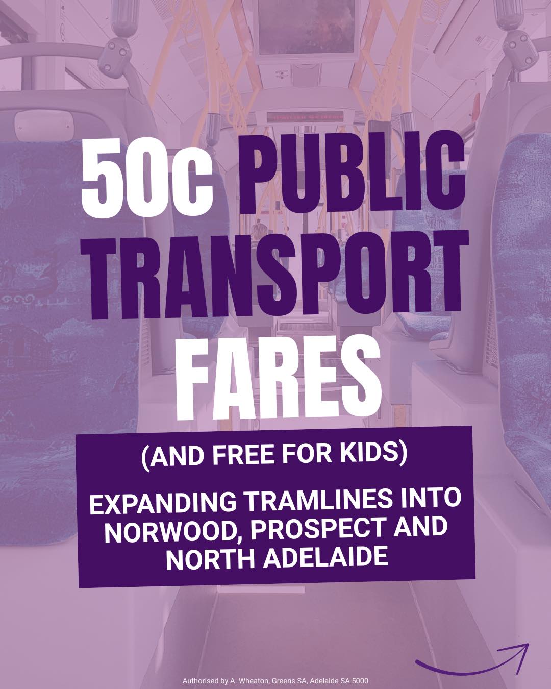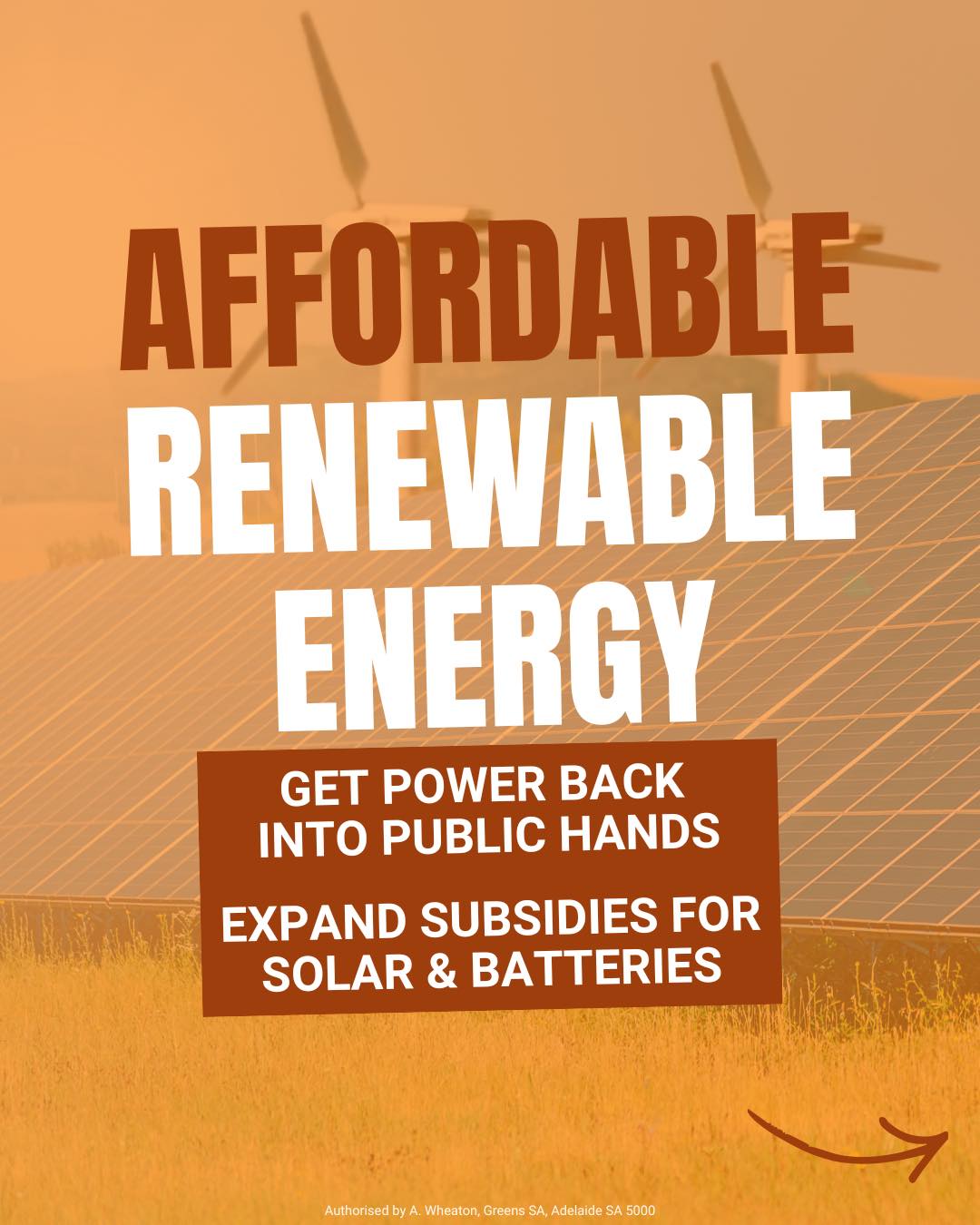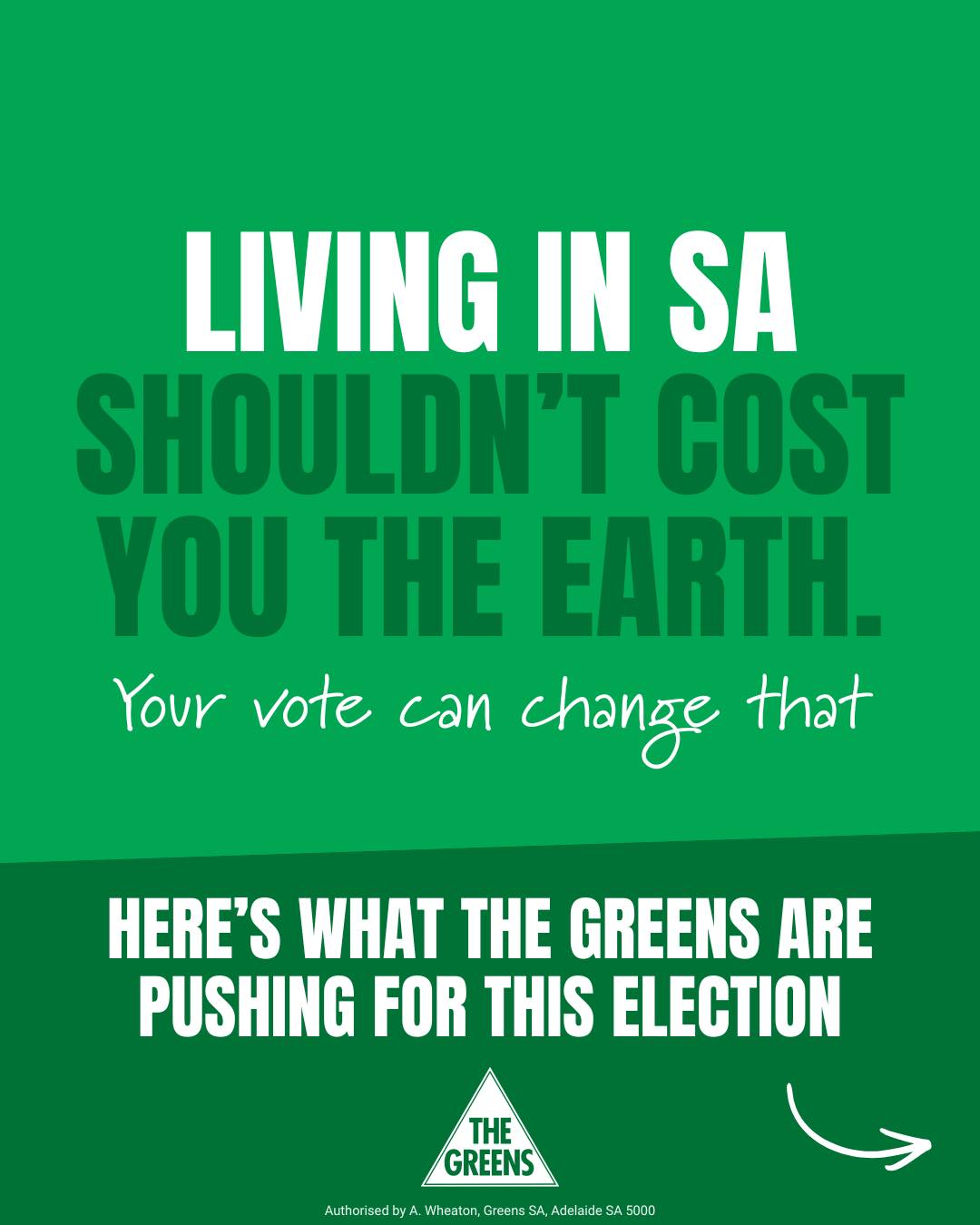 The Greens are pushing to make sure the basics are affordable and accessible for everyone, by investing in public services like transport, housing, healthcare, energy, and education. We will safeguard our future by taking action on the climate crisis, protecting our precious natural places, keeping SA nuclear-free, and focusing on renewable energy.