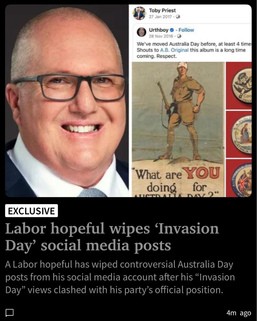 Labor candidate, Toby Priest, has deleted the history of his views on Australia Day.