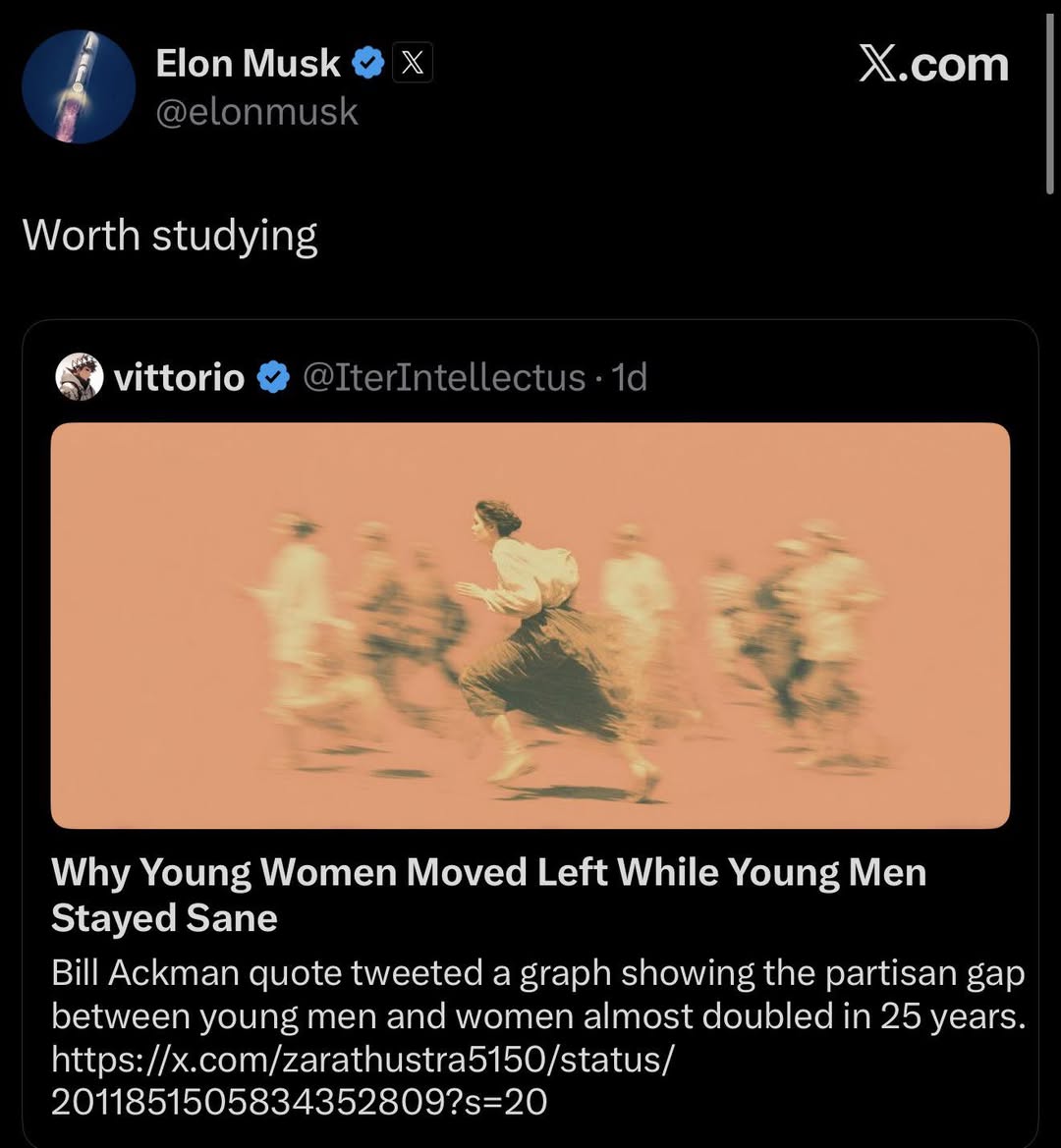 I’ve warned for years about women drifting towards authoritarianism and Marxism. Their natural empathy makes them more susceptible to manipulation by globalist ideology, empathy that is now being weaponised against them and against our civilisation. This is an evolutionary trait being exploited. The solution? Men standing up and simply saying no. This must be openly examined and discussed, or we risk losing our civilisation. It really is that serious.